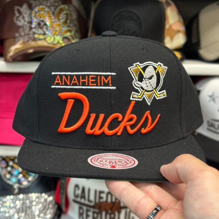 Anaheim Ducks 'Script Logo' Black/Orange Mitchell & Ness Snapback